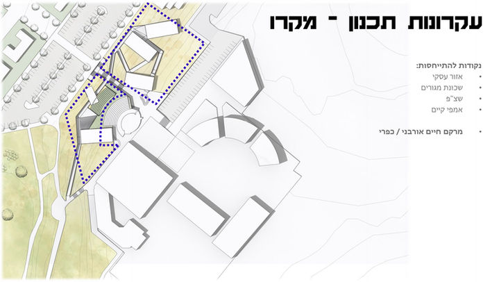 Outline Plan 26/101/02/27 established the Pedestrian Route linking the existing municipal square, which is based on the existing commercial space - through public lots 1 and 2, to the new neighborhood as a pedestrian route of central municipal importance. The proposed plan creates a "new urban piazza" at the entrance to the campus area of the municipality building, and it is proposed to establish the local council management structure. We propose that the structure be two-story, so that it will look like a landmark and urban orientation in addition to the wall that defines the new Piazza. The upper floor of the building will house the Board of Directors of the Council and the lower floor of the building, which is partially excavated according to the topography considerations. The protected area will be located, which will serve as a meeting room, meetings and an emergency outpost.